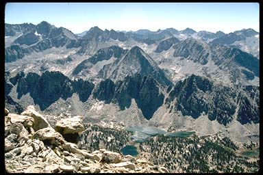 Descending toward Kearsarge Pass from Mt. Gould. Kearsarge Lakes and Pinnacles in the foreground looking toward the Kings-Kern Divide