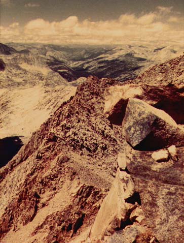 View to the west from Mt. Wallace with Evolution Valley in the background. The Wallace-Haeckel saddle is in the lower center.