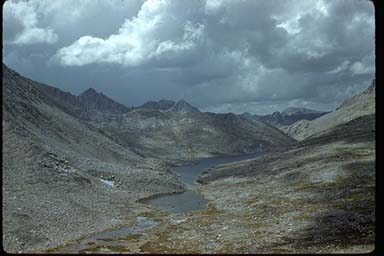 The next day dawned bright and clear, and we spent most of the morning fishing for large trout meandering among the large submerged rocks of Brown Bear Lake. Reluctantly packing up for the climb out, we made it up to our knapsack pass in the shadow of Bear Creek Spire which looked tantalizingly close. Once again the skies began to darken, and we decided it would be a good idea not to linger on the crest.